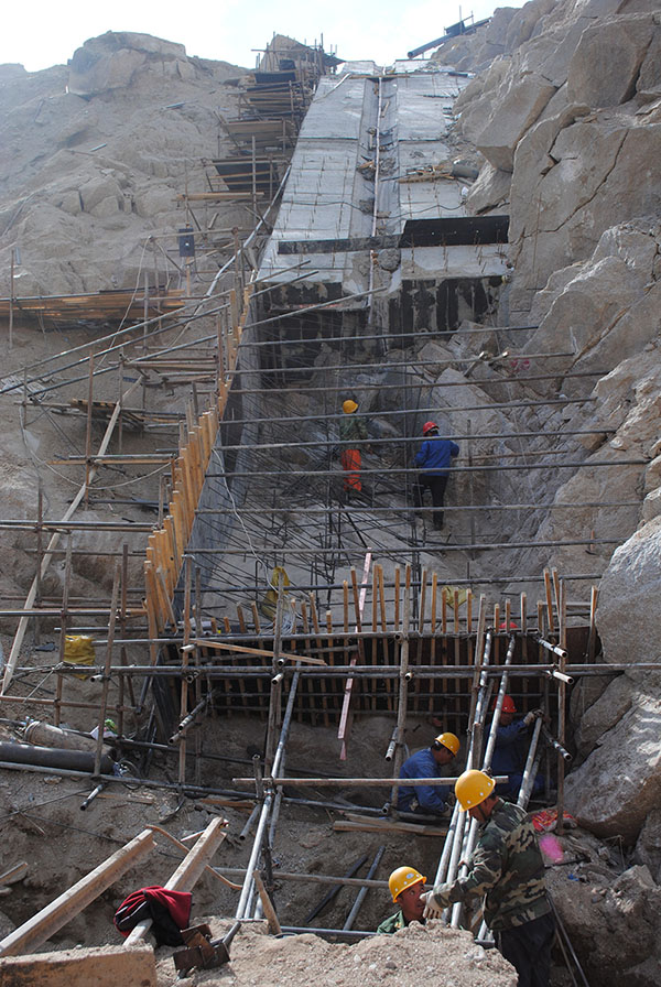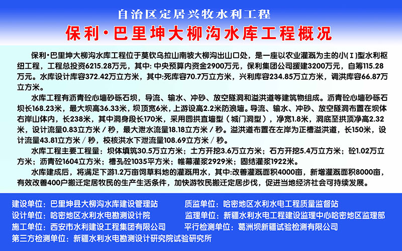 大柳溝水庫位于新疆維吾爾自治區(qū)巴里坤縣莫?dú)J烏拉山南坡,距哈密市154km。地理位置東經(jīng)93°35.5'-38',北緯43°35'-37'。水庫距巴里坤縣54.0km,有鄉(xiāng)村公路相通,交通比較便利。工程屬攔河式水庫。承擔(dān)下游灌溉、人畜用水的任務(wù),同時(shí)兼防洪功能,水庫控制灌溉面積1.2萬畝。水庫總庫容372.42萬m3,最大壩高36.33m,壩頂長168.23m。樞紐工程由攔河壩,導(dǎo)流放水洞,溢洪道等建筑物組成。工程規(guī)模屬小(1)型。